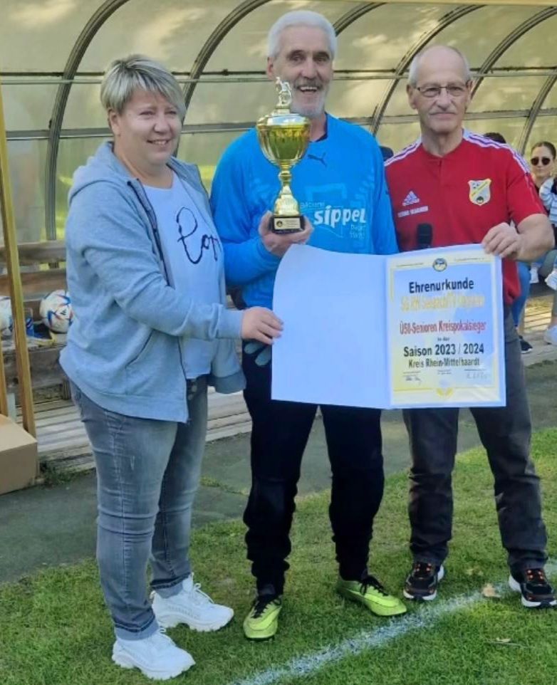 Die Siegerehrung mit Pokal und Urkunde überreichte Bernd Wagner der AH Staffelleiter im Fußballkreis Kreis-Rhein-Mittelhaardt an den Mannschaftskapitän Edwin Blaufus, und gratulierte der Spielgemeinschaft RW Seebach/TV Ungstein.